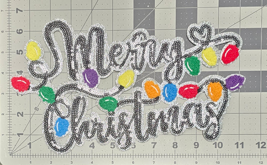 Merry Christmas Lights Black Sequin on Silver Glitter Iron-on Patch