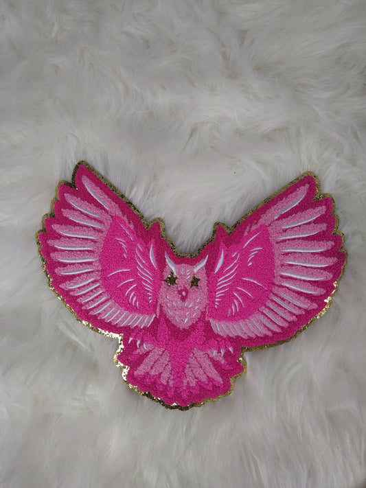 Hot Pink Owl Mascot with Star Eyes Large Chenille Iron-on Patch