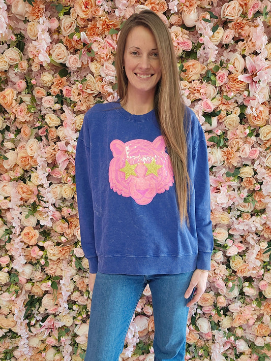Hot Pink Tiger Mascot Sewn on Sequin Acid Wash Crew by Pretty Preppy Co.