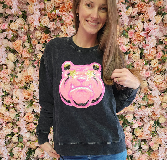 Hot Pink Bulldog Mascot Sequin on Acid Wash Crews by Pretty Preppy Co.