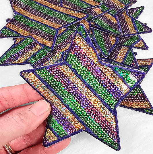 4" Mardi Gras Purple Green and Holographic Gold Sequin Star Iron On Patch