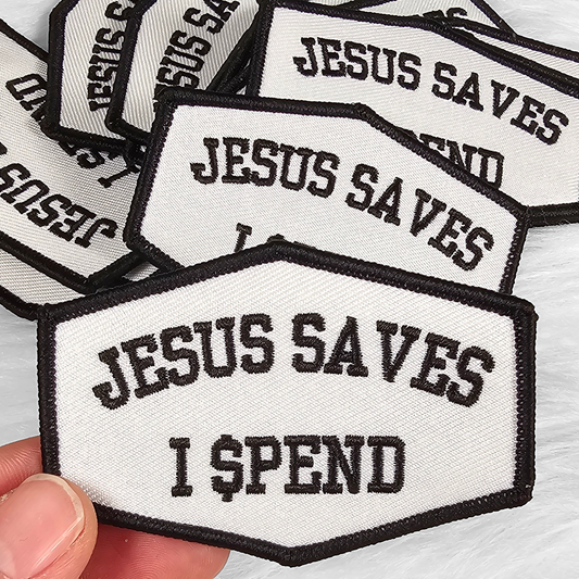 Jesus Saves I Spend Black and White Embroidery Iron On Patch