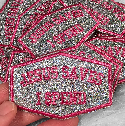 Jesus Saves I Spend Pink Embroidery on Holographic Glitter Iron On Patch