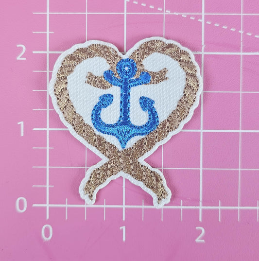 Rope Heart with Blue Anchor Sail Coastal Embroidery Iron On Patch