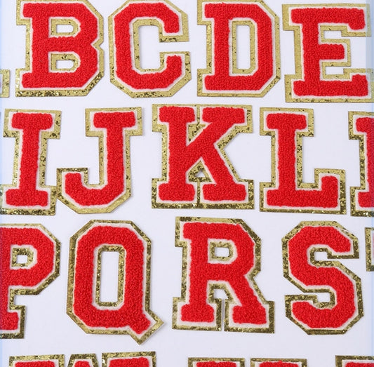 Red Chenille Iron On Gold Glitter Letter Patches
