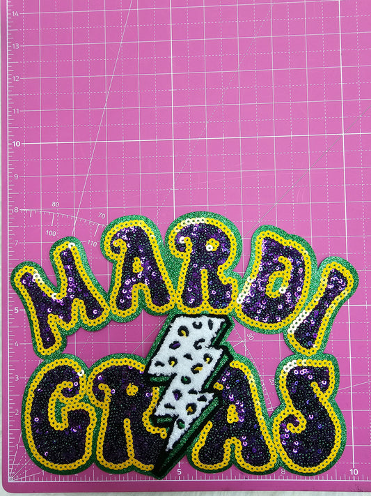 Large Mardi Gras Sequin and Chenille Combo Embroidery Iron On Gold Glitter Patch