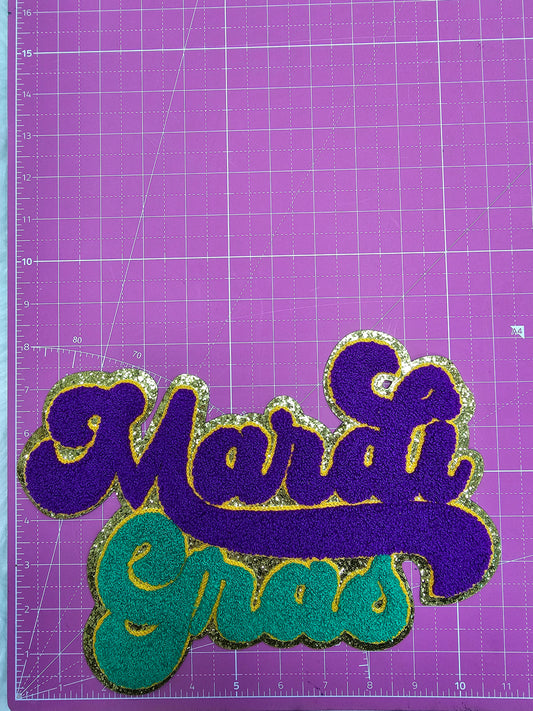 Large Mardi Gras Chenille Embroidery Iron On Gold Glitter Patch