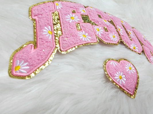 Pink JESUS with Daisy Flowers and Heart Chenille on Gold Glitter Iron-on Patch