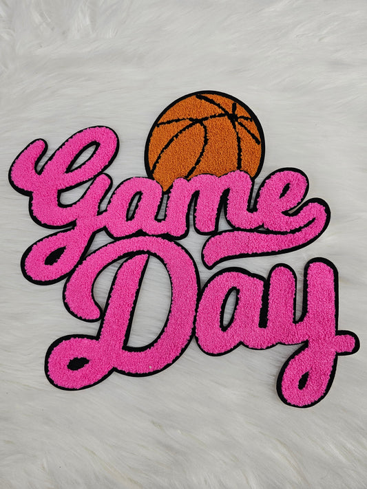 Large Game Day Basketball Chenille on Black Iron-on Patch