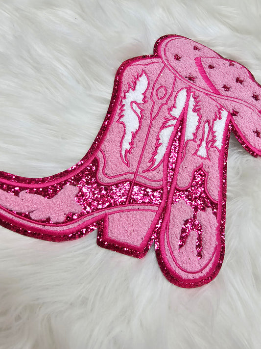 Pink Cowgirl Boots on Pink Glitter Large Chenille Iron-on Patch