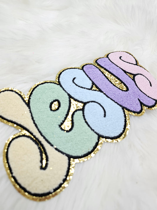 Pastel JESUS Easter Chenille on Gold Glitter Iron-on Patch