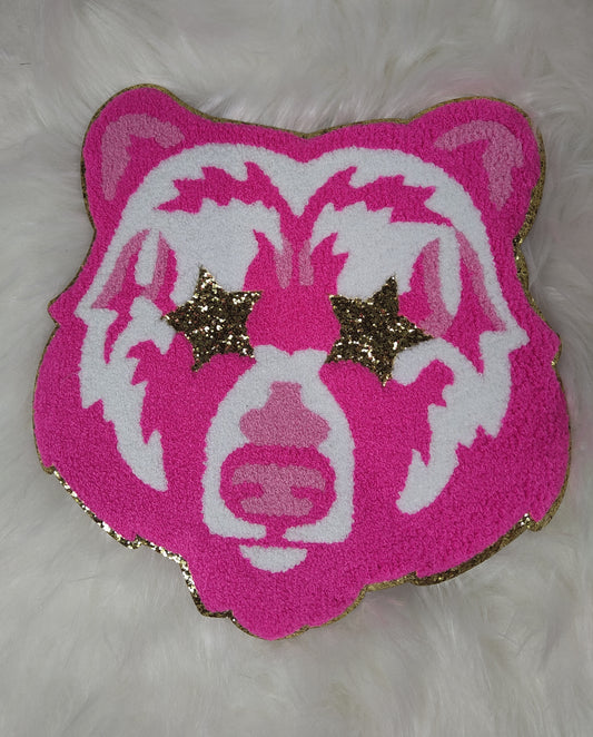 Hot Pink Bear Mascot with Star Eyes Large Chenille Iron-on Patch
