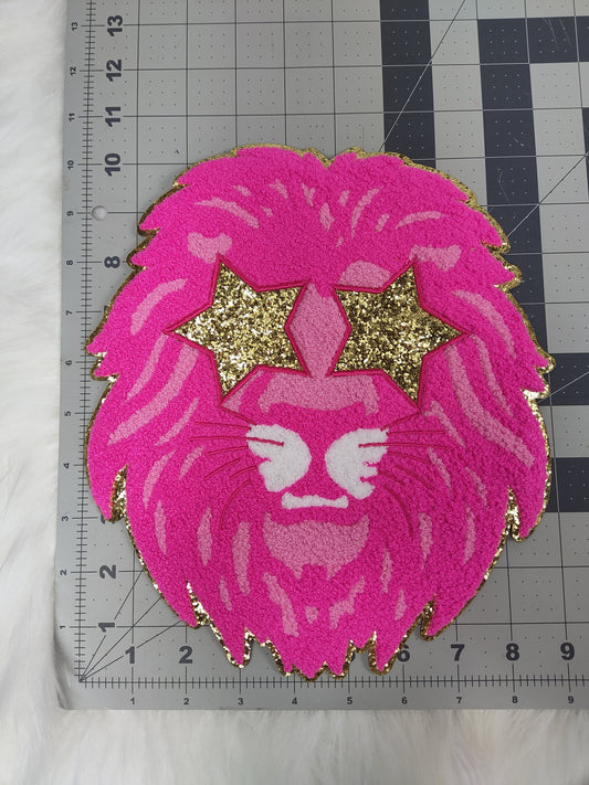 Hot Pink Lion Mascot with Star Eyes Large Chenille Iron-on Patch