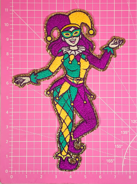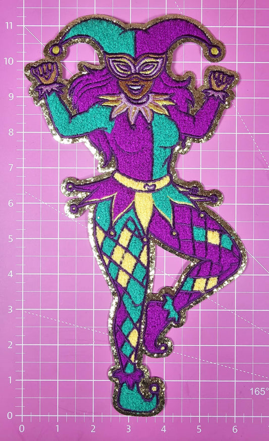 Dancing Light Skin Mardi Gras Joker Jester Chenille Glitter Large Iron On Patch