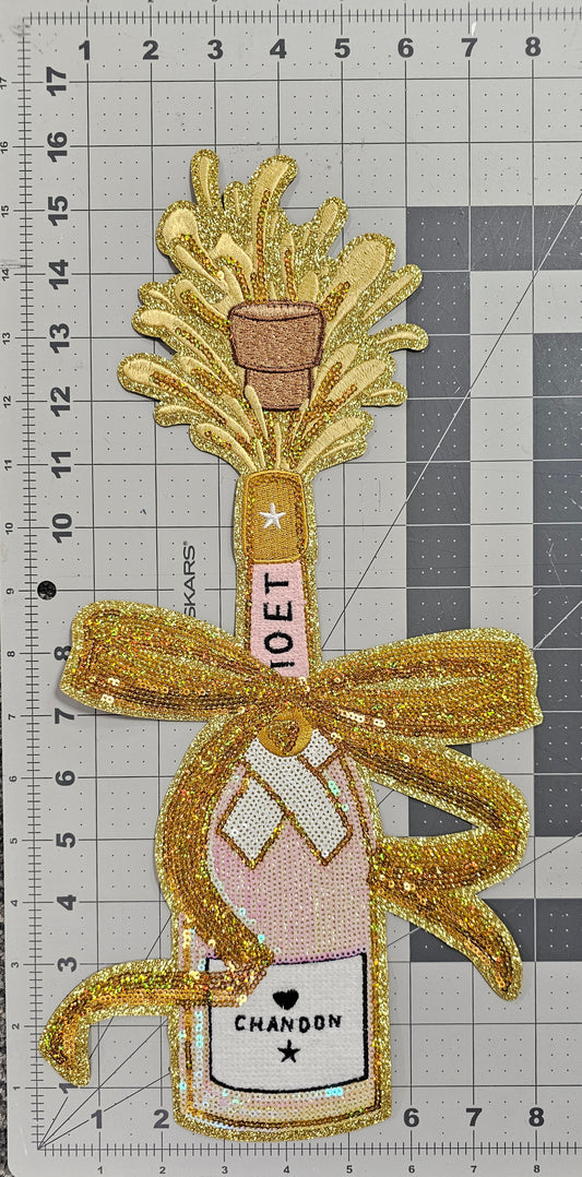 XXL Pink Rose Champagne with Bow Cheers Toast Large Sequin Iron on Patch