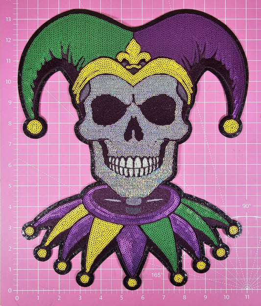 Mardi Gras Jester Skull Sequin on Black Glitter Large Iron On Patch