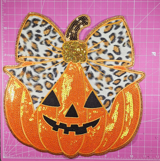 Leopard Bow Pumpkin Sequin on Glitter Large Iron on Patch