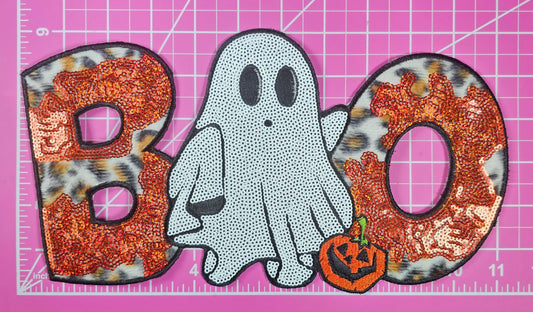 Boo Halloween Ghost Cheetah Fur Sequin Glitter Large Iron on Patch