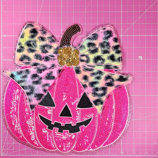 Pink Leopard Bow Pumpkin Sequin on Glitter Large Iron on Patch