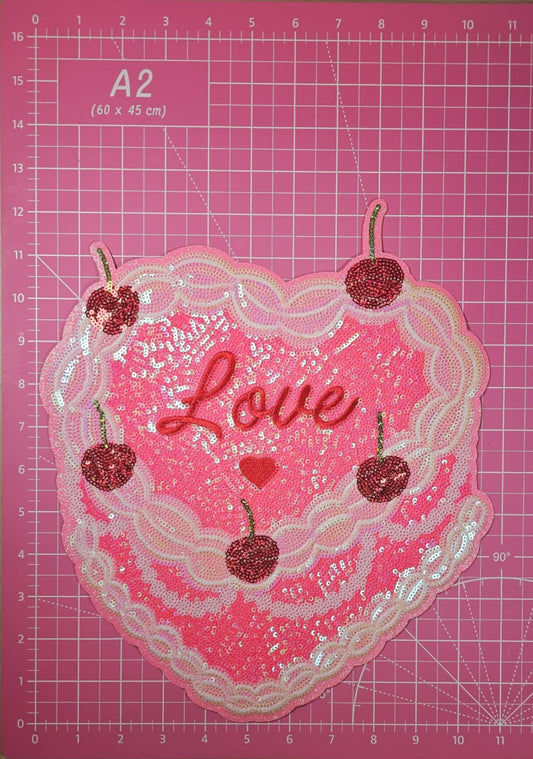 Love Valentines Cake Sequin Cherry Pink Glitter Large Iron On Patch