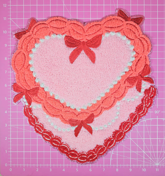 Heart Valentines Bow Cake Chenille Pink Glitter Large Iron On Patch