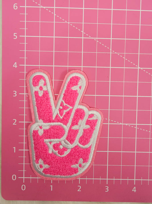 Hot Pink L V Preppy Peace Sign on Pink Felt Chenille Iron-on Patch