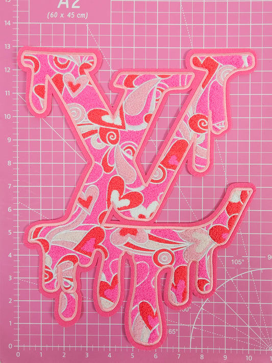 L V Drip with Pink Hearts on Pink Felt Chenille Iron-on Patch