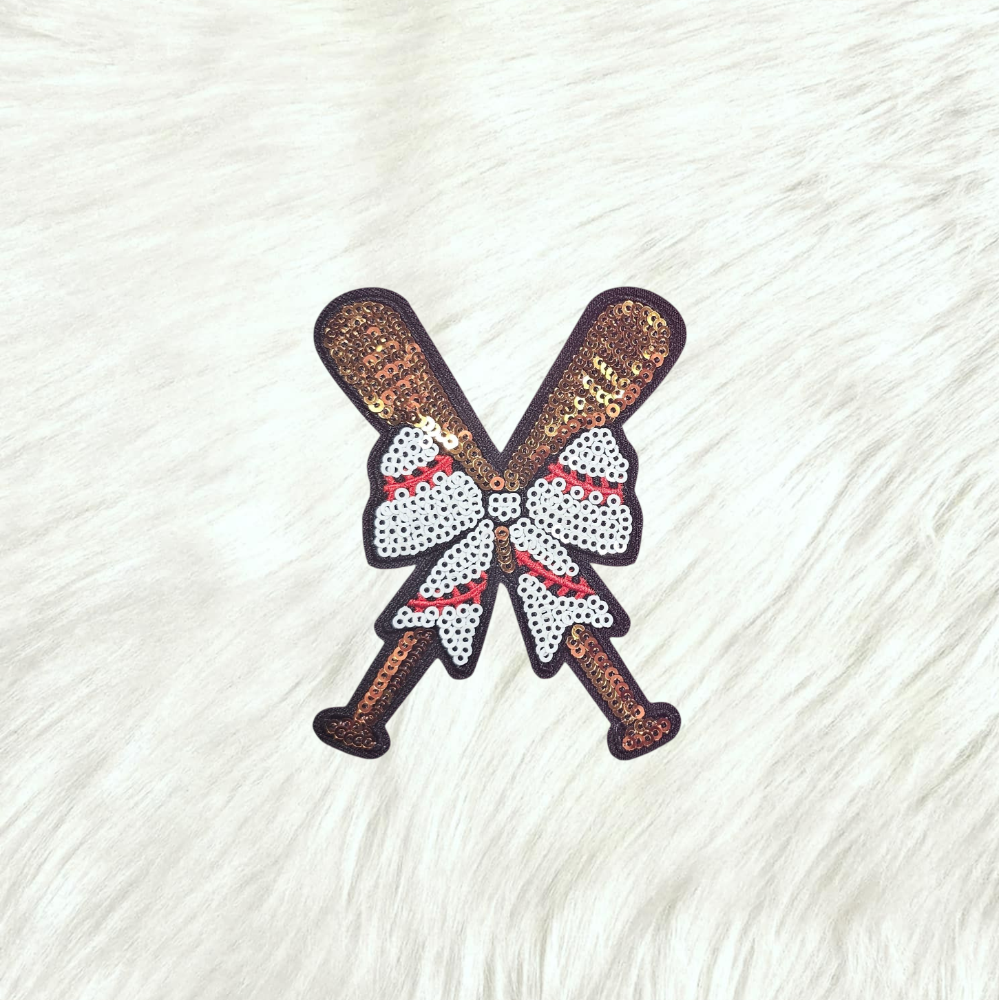 Baseball Bat Bow Sequin Black Glitter Small Iron On Patch