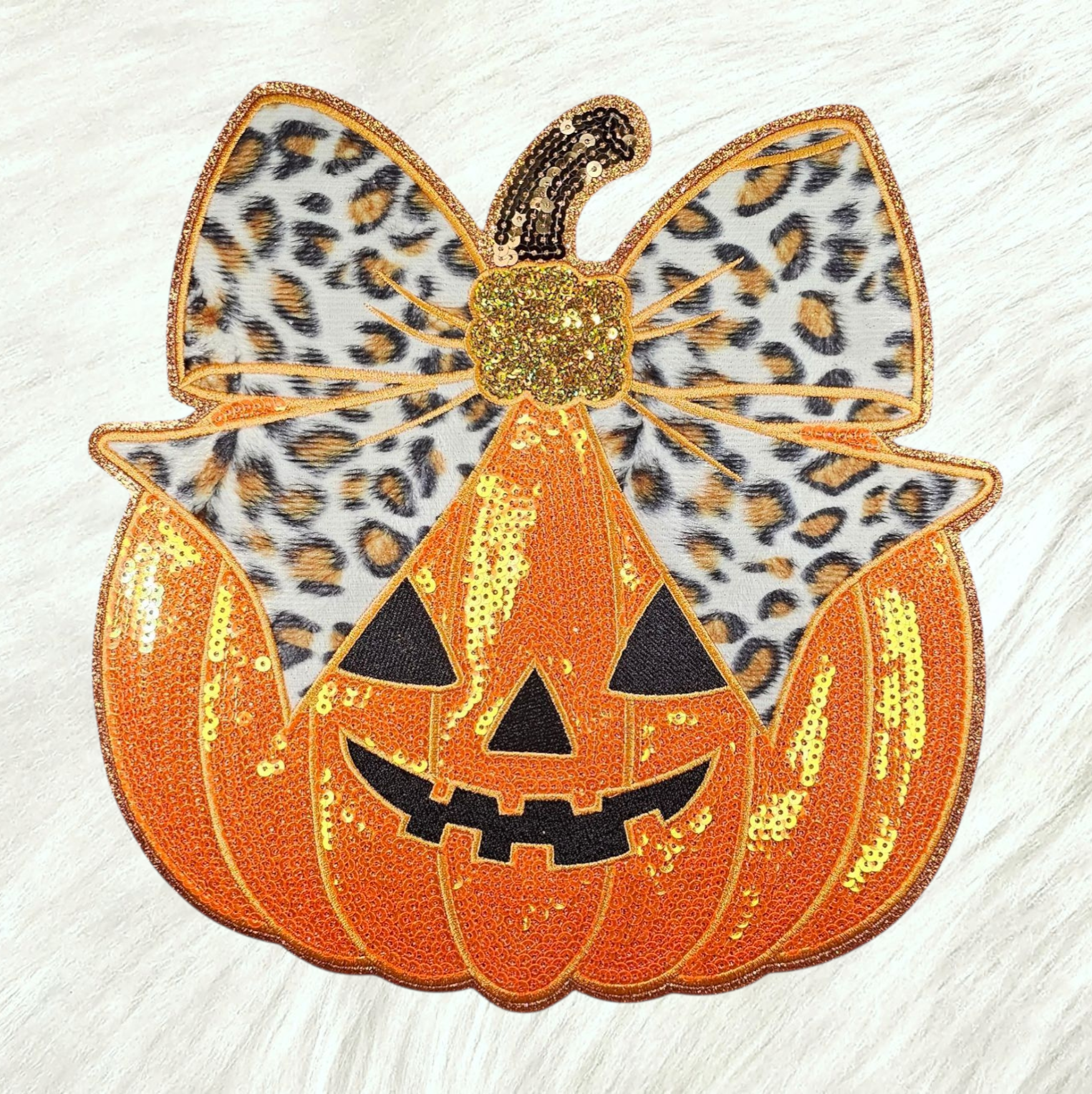 Leopard Bow Pumpkin Sequin on Glitter Large Iron on Patch
