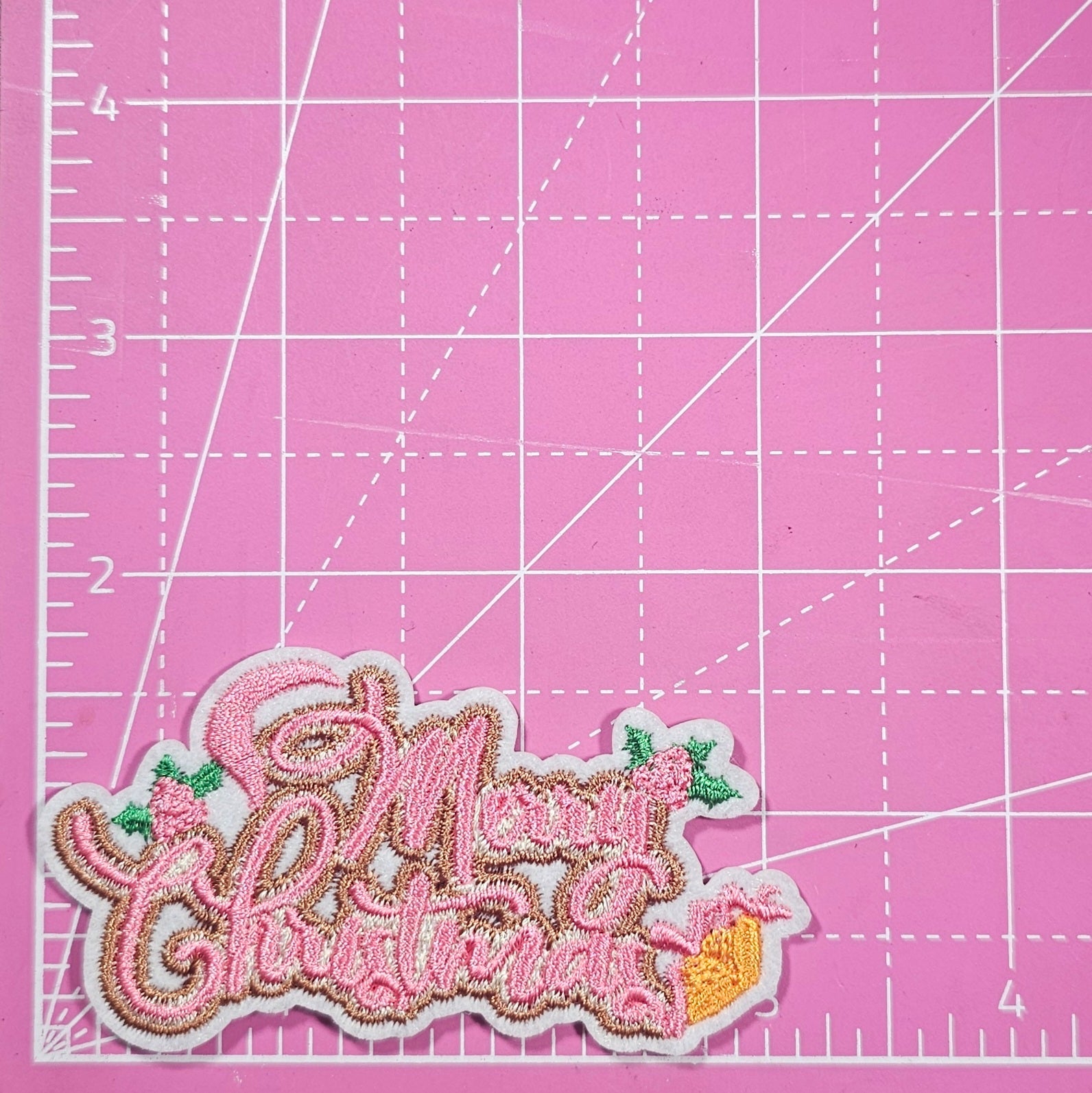 Merry Christmas Pink Holly Jingle Bells Small Embroidery Iron On Patch