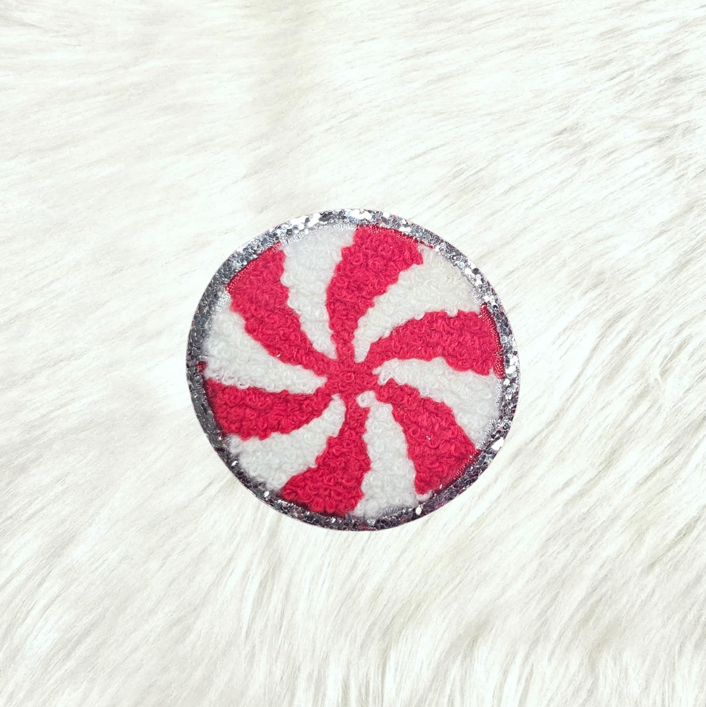 Peppermint Christmas Candy Chenille Silver Glitter Iron On Patch