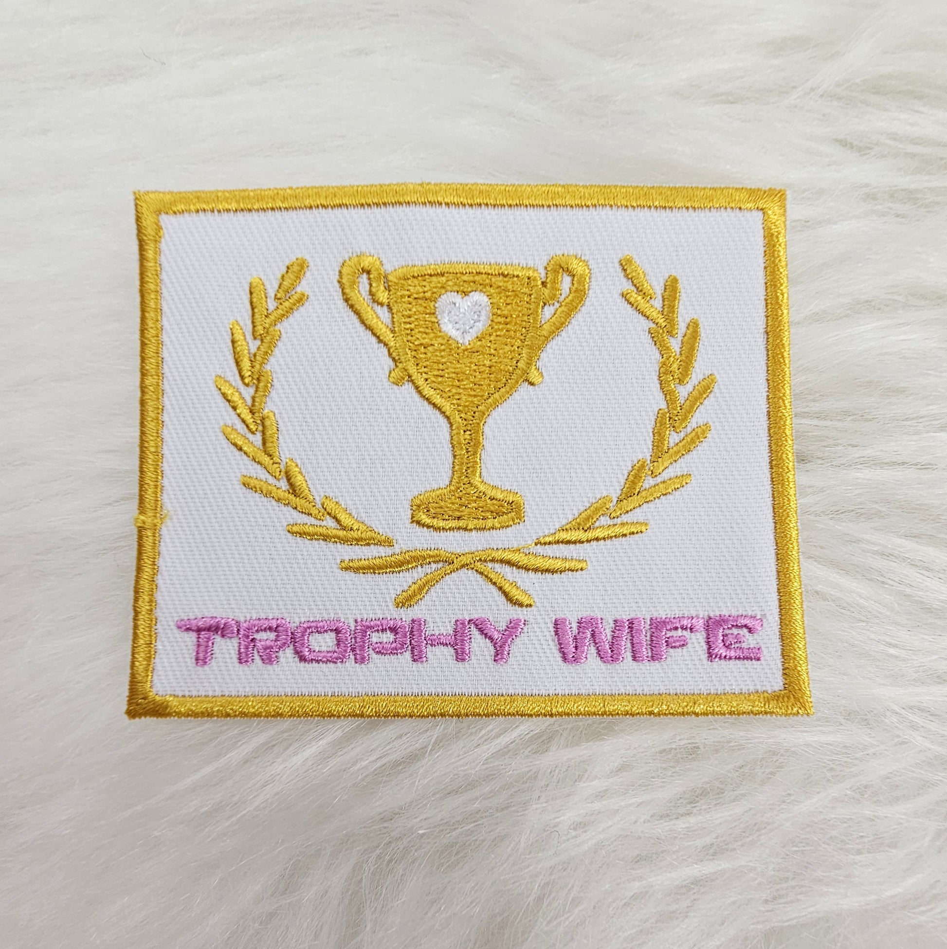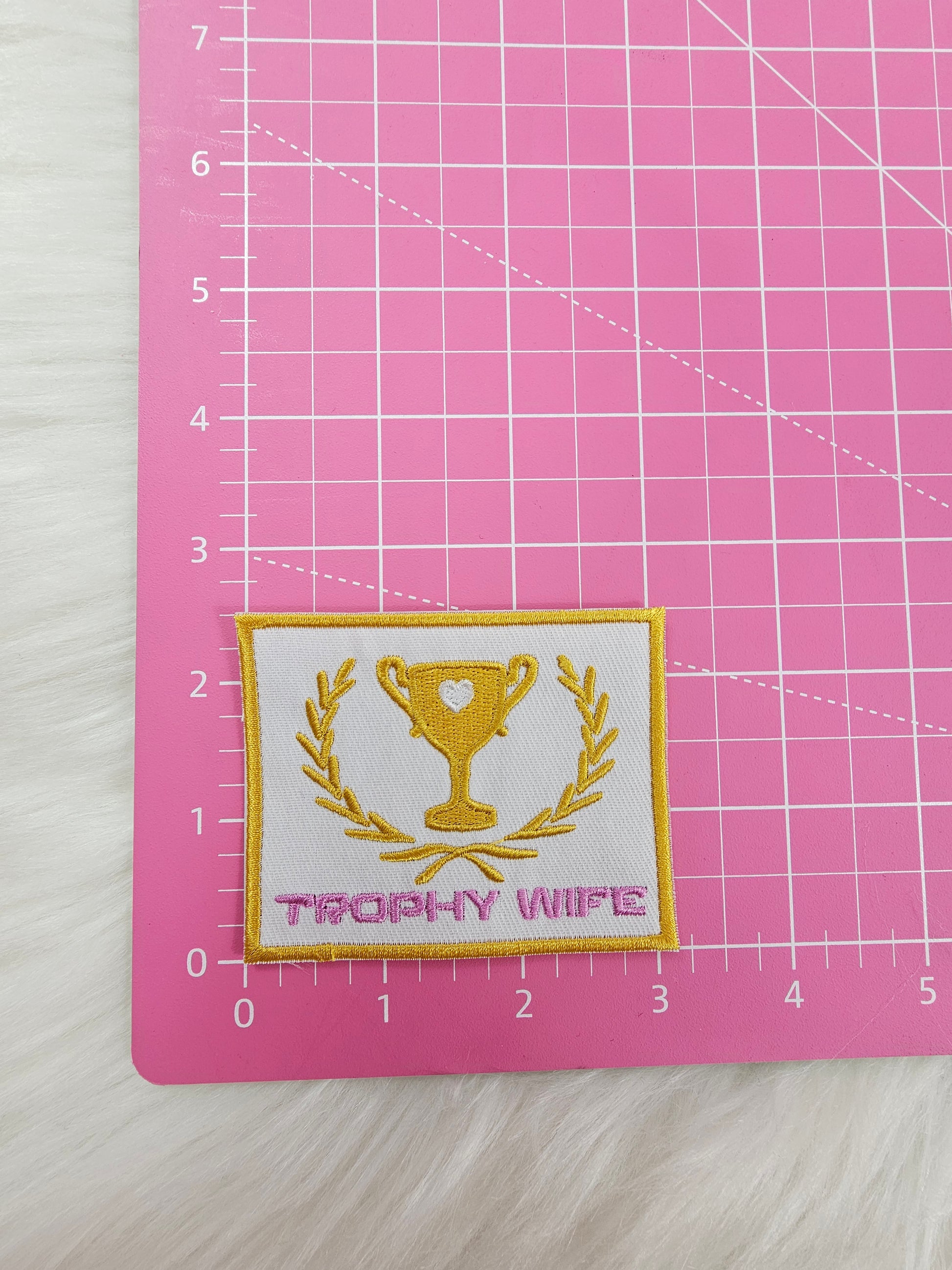 'Trophy Wife' Pink and Gold Embroidery Iron On Patch